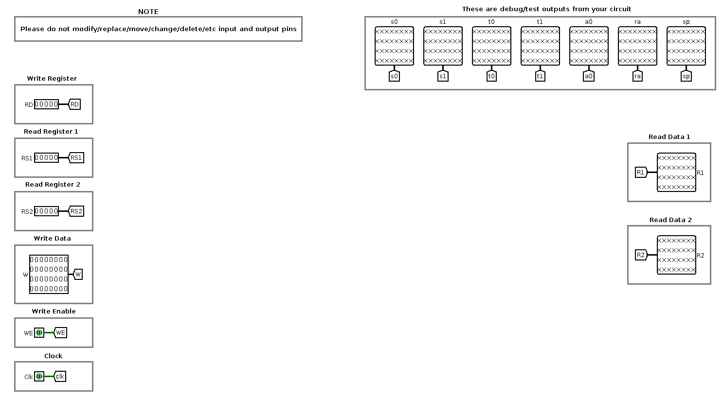 Pueden modificar regfile.circ como deseen, pero las salidas deben cumplir con el comportamiento que se indica. Deben ser cuidadosos de no modificar (mover, reemplazar, cortar, pegar, eliminar, etc.) los pines de entrada o salida. Si necesitan más espacio, pueden moverlos mientras sean cuidadosos de mantener el posicionamiento relativo que estos tienen.