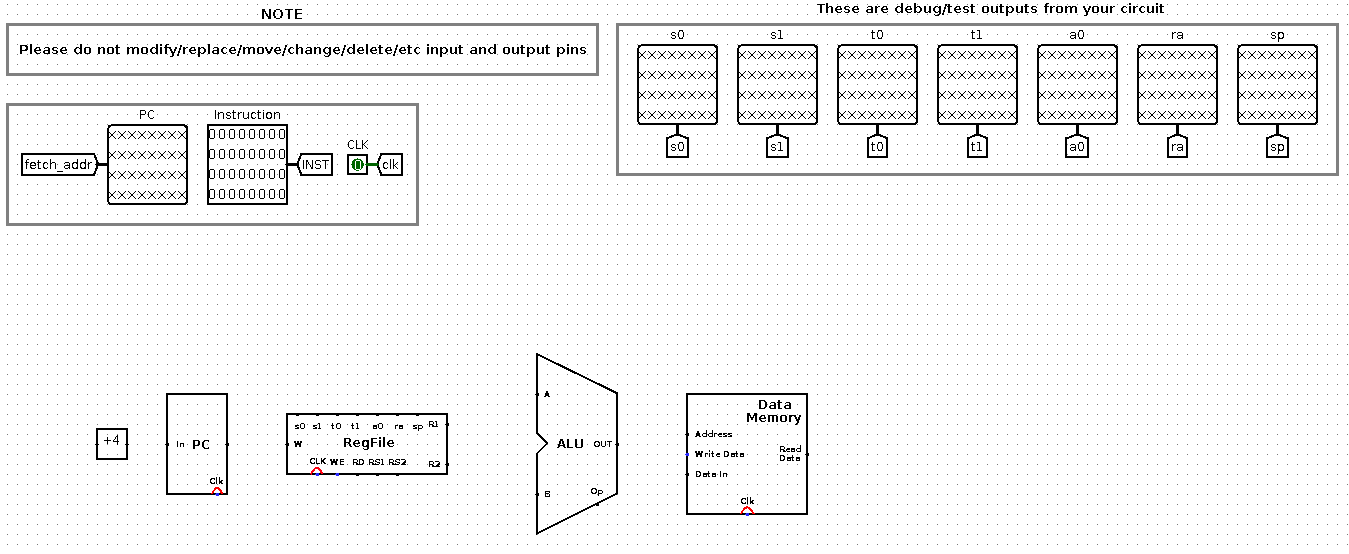 Su procesador obtendrá un programa desde el harness riscv.circ. Su procesador tendrá un output llamado FETCH_ADDRESS que indica cuál instrucción queremos, esta dirección será entregada al harness y este nos dará una instrucción. La instrucción será recibida por el procesador y será ejecutada. Revisen riscv.circ para ver exactamente qué sucede.