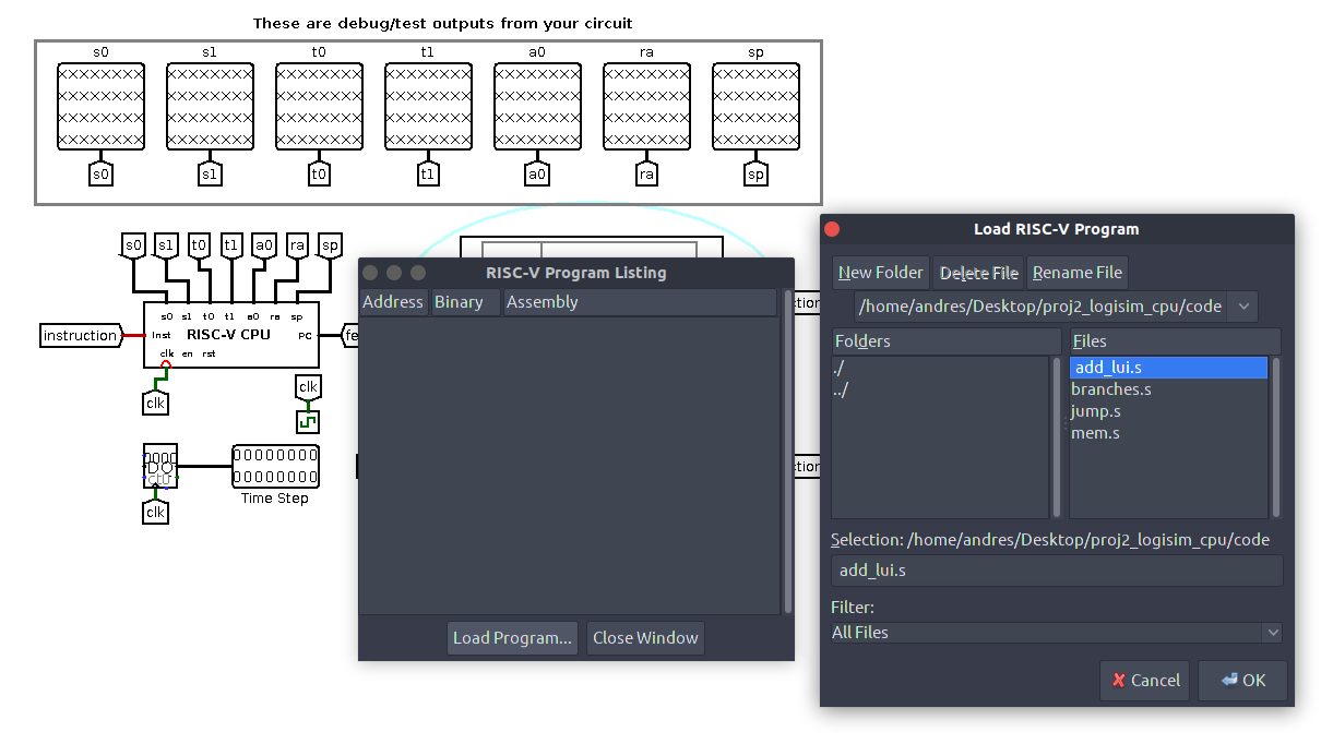 En este proyecto utilizaremos Logisim para implementar un procesador de 32-bits, cuyo ISA es un subset de las instrucciones de RISC-V. Algunos componentes del proyecto serán más sencillos que los componentes de hardware verdaderos para evitar realizar trabajo repetitivo. Nuestro ISA utiliza 32 registros de 32 bits cada uno y una memoria, cuyas direcciones son de 32 bits.