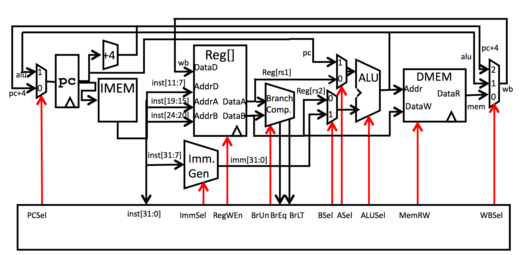 Existen varias formas de implementar las señales de control. Por ejemplo, pueden construir una palabra de control y guardarla en una memoria ROM (microcódigo) o pueden construir un circuito que elija qué acción tomar basándose en algunos bits del opcode, func3 y func7.