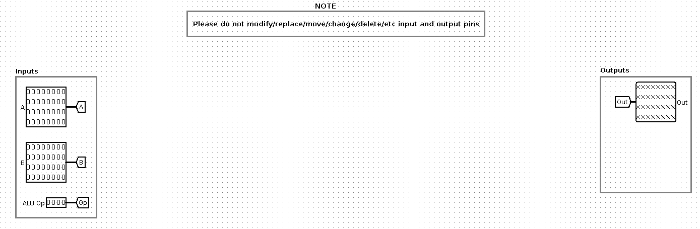 Su ALU debería de encajar con el harness alu-harness.circ. Sigan las mismas instrucciones que en el register file. En particular, ustedes deberían de asegurar que su ALU encaja correctamente en el harness.
